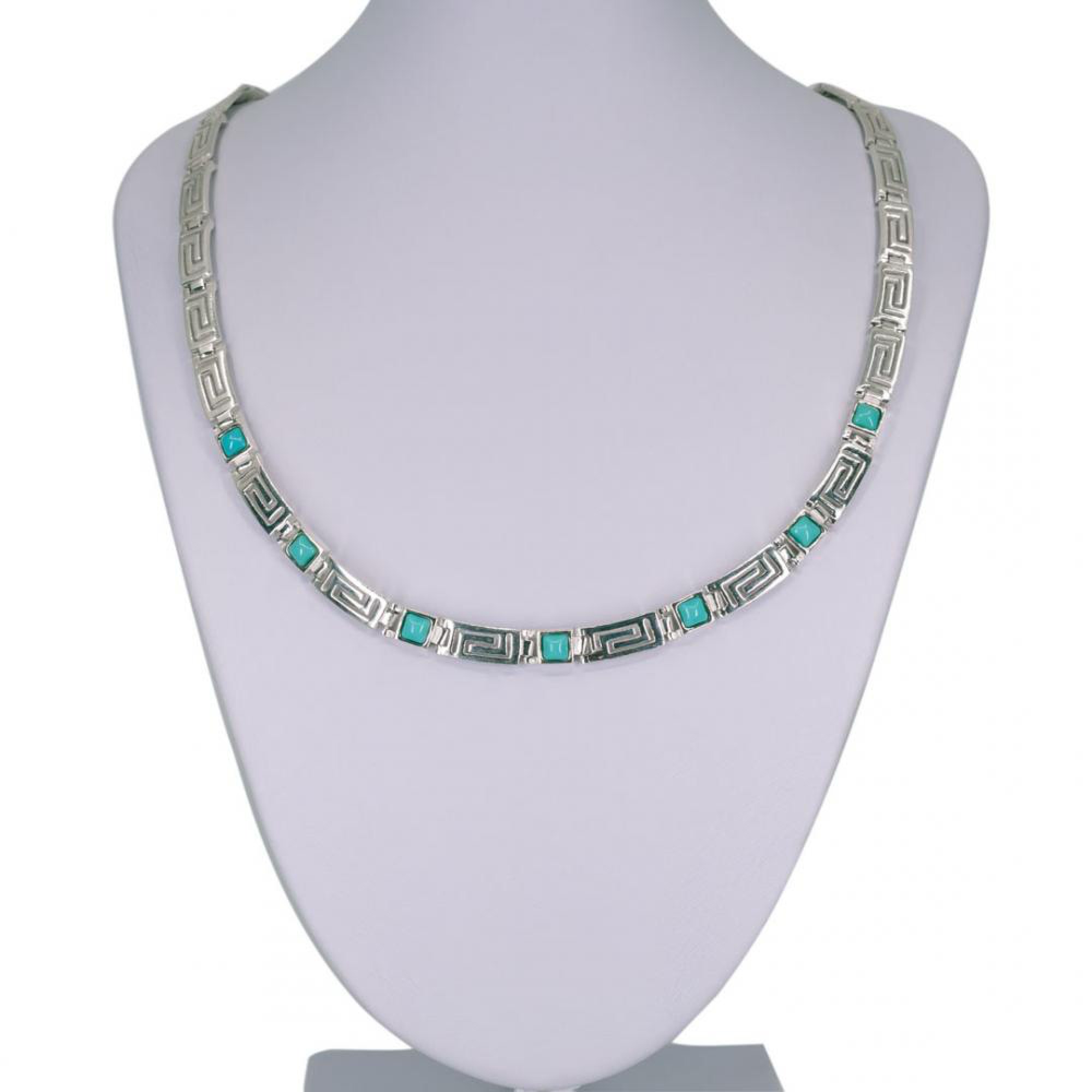 Εντυπωσιακό κολιέ μαίανδρος με πέτρες τιρκουάζ με αρχαιοελληνικές επιρροές για εμφανίσεις που ξεχωρίζουν.
