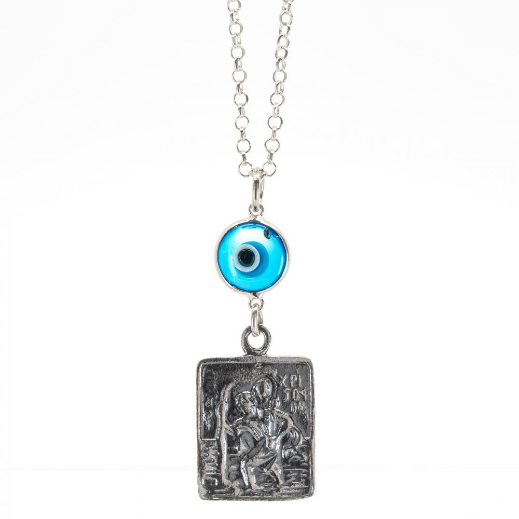 Από τη μία πλευρά του φυλαχτού απεικονίζεται η Παναγία και από την άλλη ο Άγιος Χριστόφορος, ο προστάτης των οδηγών.