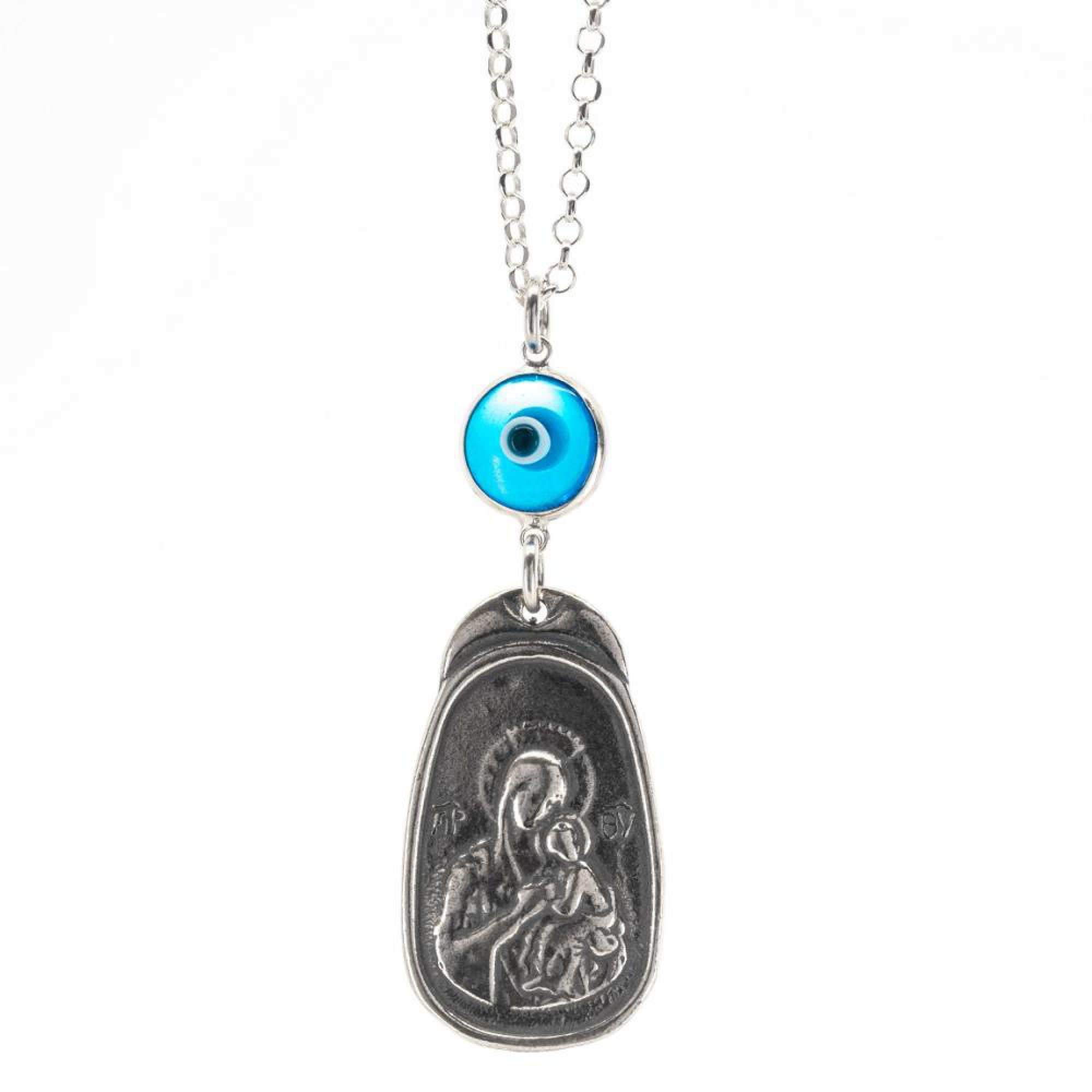 Από τη μία πλευρά του φυλαχτού απεικονίζεται η Παναγία και από την άλλη ο Άγιος Χριστόφορος, ο προστάτης των οδηγών.